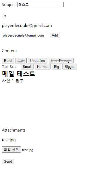 이후, 메일을 전송하여 본다. 받는 사람과 첨부파일을 설정하여 잘 전송되는지 확인한다.